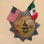 The disc hangs on the wall of my den at a height where we look at each other – eye-to-eye – while I’m writing. Its taffy-colored face has a blue nose and lips, but the right side of the face is brown and shaped like a crescent moon with one eye. Uniting of the sun and the moon is a common motif in Mexican art. To it, I’ve tucked small American and Mexican flags, their staffs crossed behind a gap between one of the eleven triangular ‘rays’ surrounding the face.